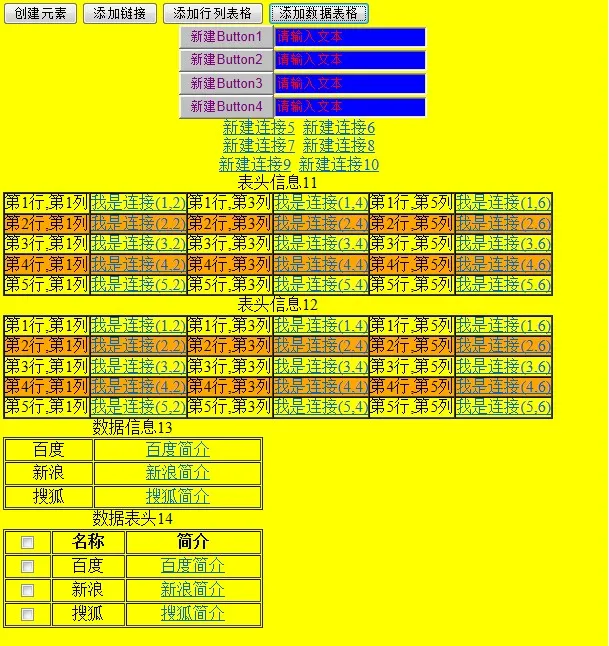 主要是使用JavaScript动态创建按钮、文本、链接、表格、加上CheckBox的表格(简单实现全选),这里Table的数据是页面数据,不是服务端数据,主要是与后面的JQuery和ExtJs请求服务端数据动态创建Table的差异比较。