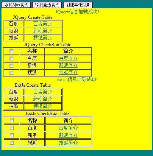 主要是对JQuery、ExtJs的Ajax使用以及如何使用JQuery、ExtJs动态创建Table对象填充数据,简单实现CheckBox的全选操作。服务端的代码是第4点的一般处理程序。效果图: