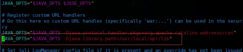 如图所示在原有变量JAVA_OPTS后面追加对应的配置即可,添加一行新的就可以:JAVA_OPTS="$JAVA_OPTS -Djava.library.path=/usr/local/apr/lib"
