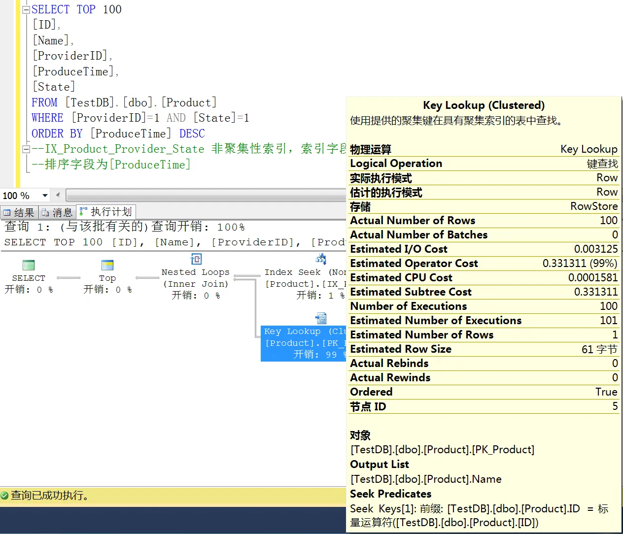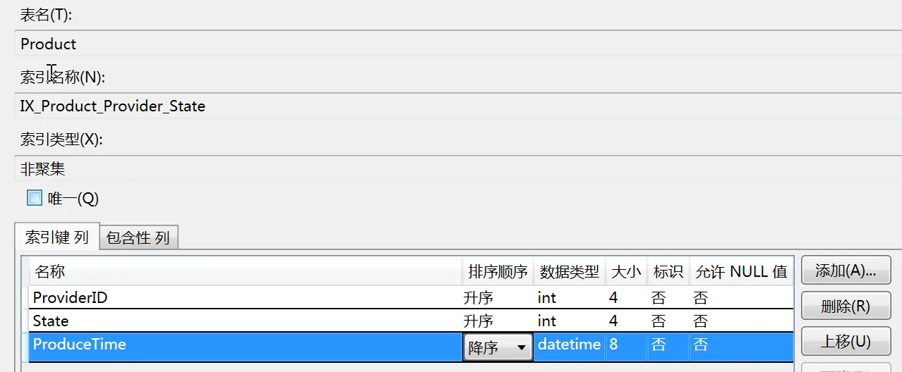 从上面的执行计划中,我们可以很直观的看出差别,所以在写 SQL 的时候,一定要慎重啊,这边为了方便展示,我们还是以 ProduceTime 字段进行排序,按照 ID 排序,虽然没有了 SORT 性能开销,但是发现查询记录为“Clustered Index Scan”,这是全表查询的意思,我们理想的应该是“Index Seek”或者“Clustered Index Seek”,因为这种是按照索引查询,速度最快。按照我们程序员的理解,应该创建一个非聚集索引,比如下面 IX_Product_Provider_State 索引: