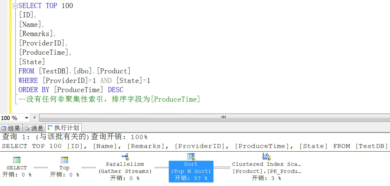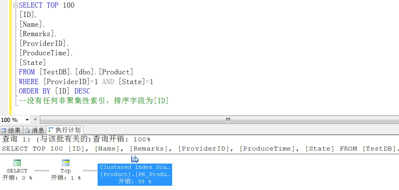 可以看到,查询开销基本上被 SORT 霸占了,看到这种情况,按照正常的思维,我们首先考虑的是为 ProduceTime 创建一个非聚集索引,然后按照 DESC 排序,但有时候我们要沉下心思考一下,是不是用 ID 排序会更好呢?因为在 Product 表中,ID 为自增字段,ProduceTime 在添加的时候获取的是当前时间,在 SQL 排序中,其实 ID 和 ProduceTime 的排序效果是一样的,但是执行性能方面确实天壤之别,我们看一下执行计划就知道了: