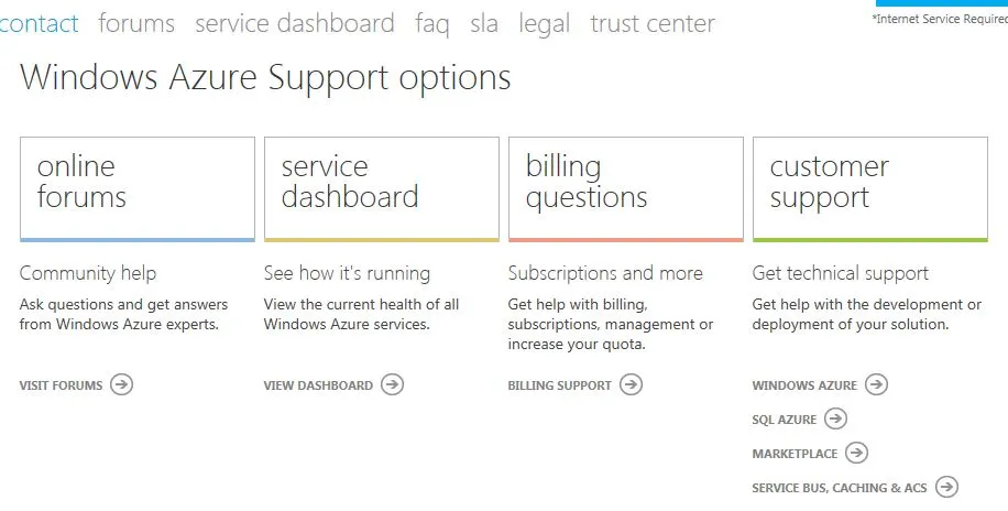 在多个云计算平台中,Azure的服务支持算是比较好的,任务问题都可以提交一个服务单(Support Ticket),网址如下:https://www.windowsazure.com/en-us/support/contact/