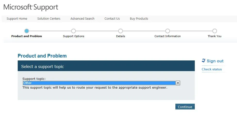 如果是注册问题,请选择Billing support,然后选择Other,如果是运行时的问题,可以选择Windows Azure或者SQL Azure等等具体的问题。