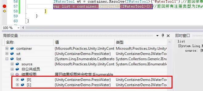我们只需要在泛型方法RegisterType传入一个名称就可以来区分了(和注册接口或基类),获取的话也只要传入注册时候的名称即可,我们看下list中的集合对象: