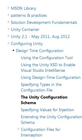 unity2.0的配置文件配置说明找了好久,终于在MSDN找到了:http://msdn.microsoft.com/en-us/library/ff660914%28v%3Dpandp.20%29.aspx#config_constructor,没有中文版本,英文不好的朋友可以使用Google简单翻译下,注意这段话“Unity 2.0 uses a new streamlined configuration schema for configuring Unity.”,这才是我们要使用的unity2.0的配置文件,其实和1.2版本差不多,只不过是简化了一些东西,配置起来也更加方便,这边就不多说了,列一下配置目录: