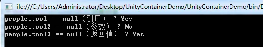 1 public static void FuTest03() 2 { 3 UnityContainer container = new UnityContainer();//创建容器 4 UnityConfigurationSection configuration = (UnityConfigurationSection)ConfigurationManager.GetSection(UnityConfigurationSection.SectionName); 5 configuration.Configure(container, "defaultContainer"); 6 VillagePeople03 people = container.Resolve<IPeople>() as VillagePeople03;//返回调用者 7 Console.WriteLine("people.tool == null(引用) ? {0}", people.tool == null ? "Yes" : "No"); 8 Console.WriteLine("people.tool2 == null(参数) ? {0}", people.tool2 == null ? "Yes" : "No"); 9 Console.WriteLine("people.tool3 == null(返回值) ? {0}", people.tool3 == null ? "Yes" : "No"); 10 }