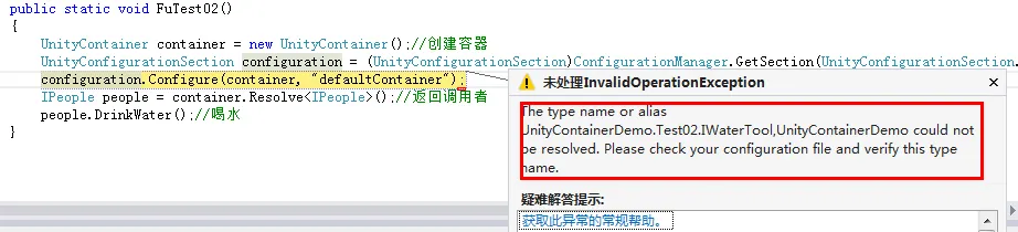 第一个错误是“UnityContainerDemo.Test02.IWaterTool,UnityContainerDemo”未被识别,第二个错误是“UnityContainerDemo”程序集无效,这种是使用UnityConfigurationSection方式注册的,使用RegisterType方法注册就没什么问题,不知道是我节点配置有问题,还是代码写的有问题,如果有知道的朋友,还请赐教,为了这个问题,调试了好久,最终没办法把代码都单独放开。