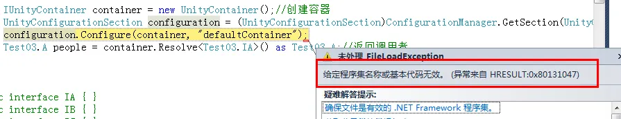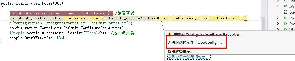 根据上面的配置,我做了一个简单的方法注入示例,配置注册信息都是在文件中,并不是使用RegisterType方法进行注册,但是报下面错误: