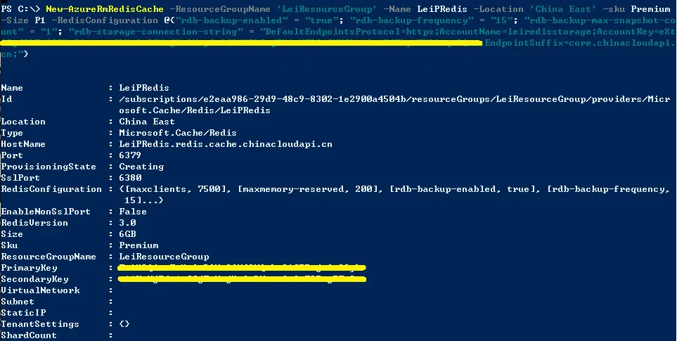 #弹出界面输入用户名密码 Add-AzureRmAccount -EnvironmentName AzureChinaCloud #设置当前订阅名称 Select-AzureRmSubscription –SubscriptionName 'Internal Billing'| Select-AzureRmSubscription #在中国东部数据中心,创建新的资源组 New-AzureRmResourceGroup -Name 'LeiResourceGroup' -Location 'China East' #创建新的P1级别的Azure Redis Cache #注意下面的参数中,"rdb-backup-enabled" = "true"表示启用备份 #"rdb-backup-frequency" = "15"表示备份最低频率为15分钟 #AccountName为存储账号的名称,我们这里设置为leiredisstorage #AccountKey为存储账号的密钥 New-AzureRmRedisCache -ResourceGroupName 'LeiResourceGroup' -Name 'LeiPRedis' -Location 'China East' -sku Premium -Size P1 -RedisConfiguration @{"rdb-backup-enabled" = "true"; "rdb-backup-frequency" = "15"; "rdb-backup-max-snapshot-count" = "1"; "rdb-storage-connection-string" = "DefaultEndpointsProtocol=https;AccountName=leiredisstorage;AccountKey=[YourAccountKey];EndpointSuffix=core.chinacloudapi.cn;"}