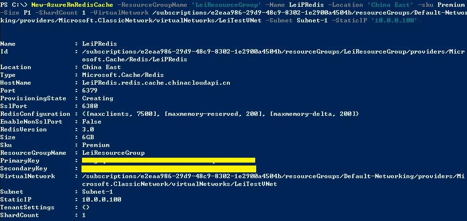#加入到之前创建的Virtual Network,名称为LeiTestVNet #加入到子网Subnet-1中 #设置改Redis Cache的内网IP为10.0.0.100 New-AzureRmRedisCache -ResourceGroupName 'LeiResourceGroup' -Name LeiPRedis -Location 'China East' -sku Premium -Size P1 -ShardCount 1 -VirtualNetwork /subscriptions/e2eaa986-29d9-48c9-8302-1e2900a4504b/resourceGroups/Default-Networking/providers/Microsoft.ClassicNetwork/virtualNetworks/LeiTestVNet -Subnet Subnet-1 -StaticIP '10.0.0.100'