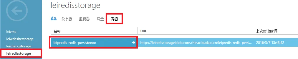 显示结果,我们观察到在上面的存储账号leiredisstorage,创建了一个新的Container。如下图: