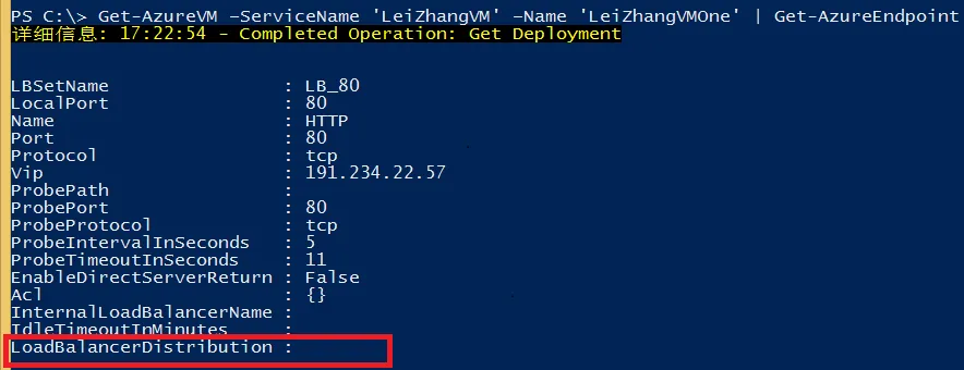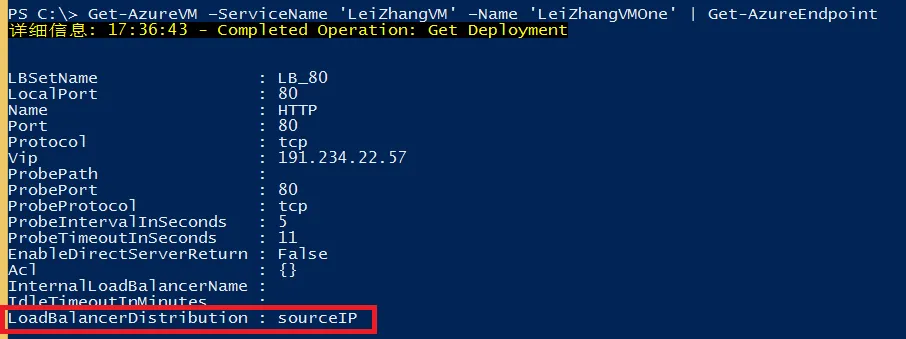 Set-AzureLoadBalancedEndpoint -ServiceName 'LeiZhangVM' -LBSetName 'LB_80' -Protocol tcp -LocalPort 80 -ProbeProtocolTCP -ProbePort 80 –LoadBalancerDistribution 'sourceIP'