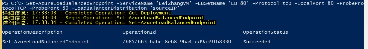 Set-AzureLoadBalancedEndpoint -ServiceName 'LeiZhangVM' -LBSetName 'LB_80' -Protocol tcp -LocalPort 80 -ProbeProtocolTCP -ProbePort 80 –LoadBalancerDistribution 'none'