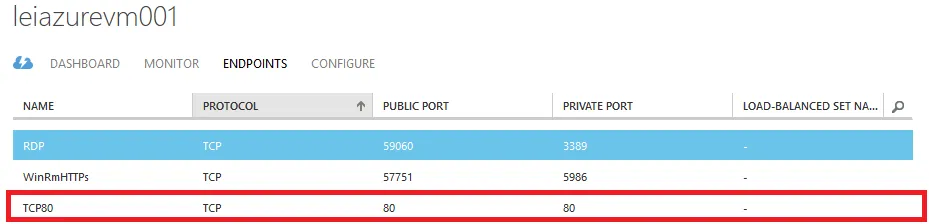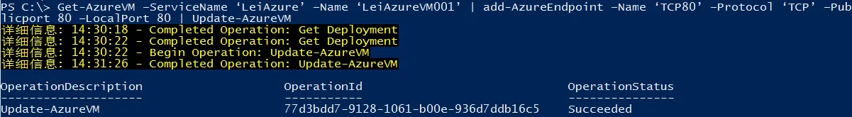 Get-AzureVM –ServiceName ‘LeiAzure’ –Name ‘LeiAzureVM001’ | add-AzureEndpoint –Name ‘TCP80’ –Protocol ‘TCP’ –Publicport 80 –LocalPort 80 | Update-AzureVM