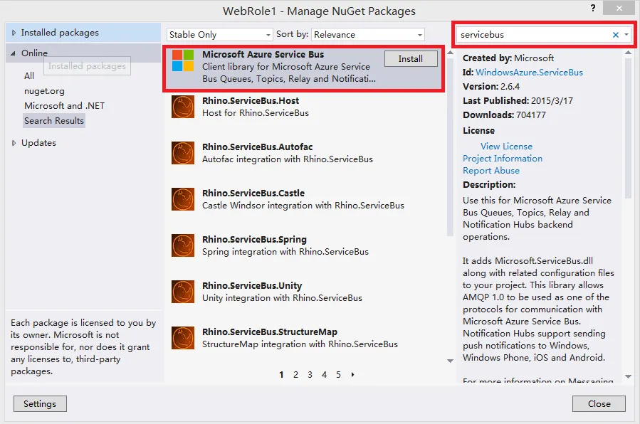 2.在WebRole1项目中,增加NuGet,添加ServiceBus引用。如下图: