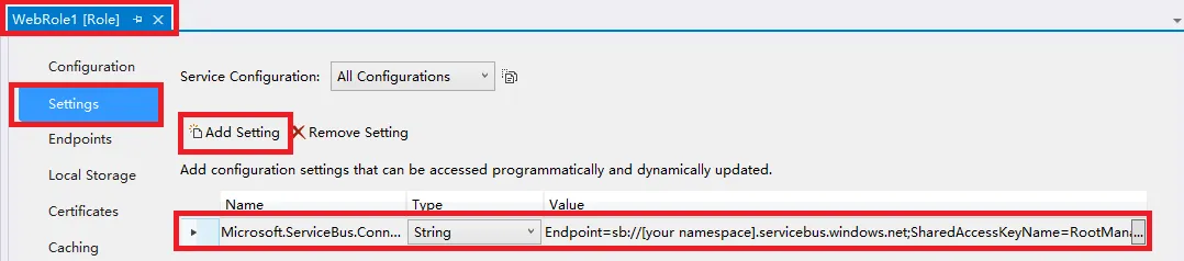 在WebRole1的Settings中,点击Add Setting增加Microsoft.ServiceBus.ConnectionString对象,如下图: