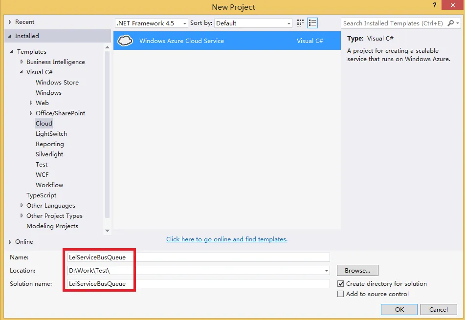 2.创建一个新的Cloud Service,命名为LeiServiceBusQueue,如下图:
