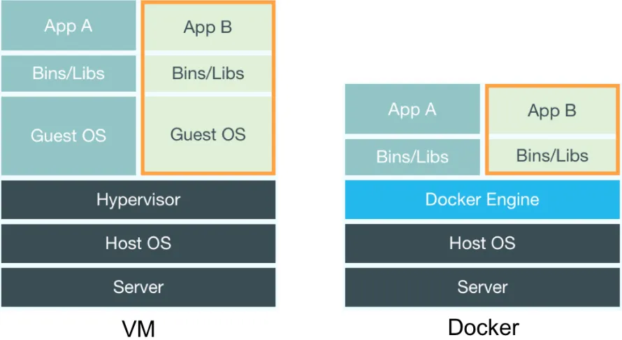Docker 是一个开源的应用容器引擎,让开发者可以打包他们的应用以及依赖包到一个可移植的镜像中,然后发布到任何流行的 Linux 机器上。使用Docker可以让每个应用彼此相互隔离,在同一台机器上同时运行多个容器,他们彼此之间共享同一个操作系统。Docker的优势在于,它可以在更细的粒度上进行资源的管理,比虚拟化技术性能更高,更加节约资源。下面是普通虚拟化技术和Docker的对比。