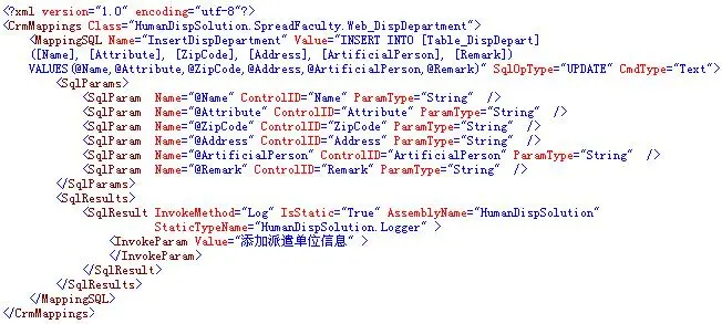 MappingFactory.ExecuteMapping(this,”HumanDispSolution.SpreadFaculty.Web_DispDepart”,”InsertDispDepartment”)。执行结果就是插入记录并记录日志。