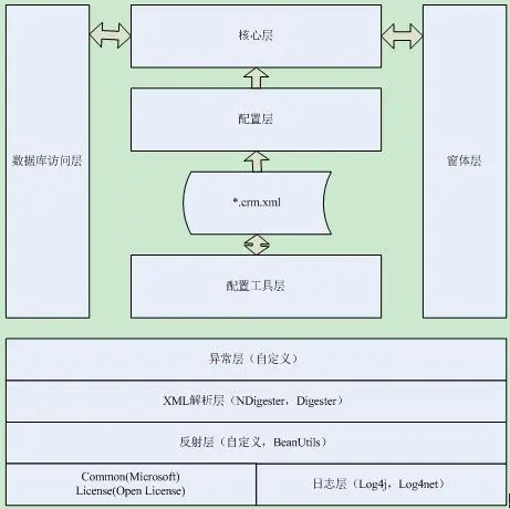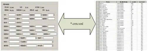 CRM概念设计图如下,其思想是利用一个XML配置文件,实现界面表单与数据库记录映射,中心思想是一条映射SQL。映射SQL的参数来自界面控件、某个类成员或方法,或者常量;映射SQL执行数据库的操作;映射执行结果是控件属性赋值、控件赋值、成员赋值、数据绑定、调用方法等。通过映射SQL很容易实现:1 进入页面后查询,执行Bind映射SQL,填充DataGrid;2 点击添加,显示一个Panel,隐藏DG Panel,保存后,执行Create映射SQL,映射结果是隐藏添加记录Panel、显示DG Panel、执行Bind映射SQL;3 Update和Create类似。因此,在我的应用中,无论表单如何复杂,代码都不会超过100行。