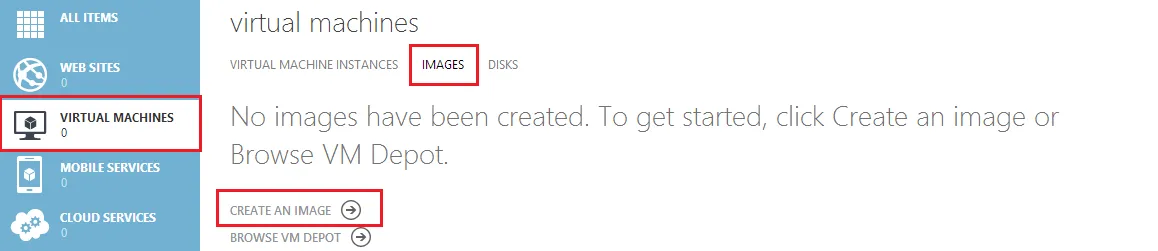 2.选择Virtual Machine,点击右侧的Images页,最后选择Create An Image。如下图:
