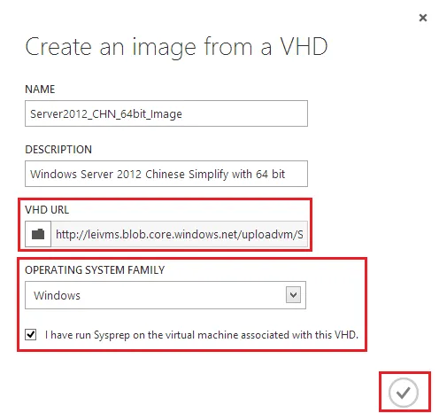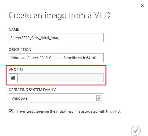 3.在弹出的窗口里,设置镜像的名称(NAME)和描述(Description),并且点击红色区域VHD URL。如下图: