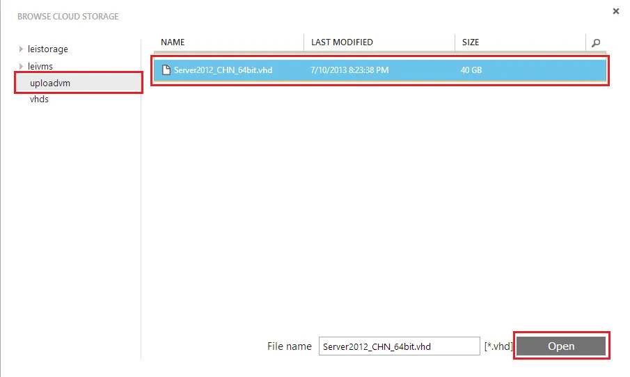 我们依次展开leivms, uploadvm,找到之前上传的Server 2012的vhd。最后点击OPEN。如下图: