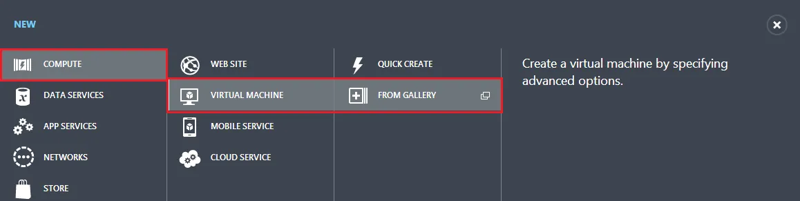 7.我们点击Azure Management Portal,分别点击NEW->Compute->Virtual Machine->FROM Gallery。如下图:
