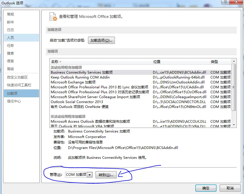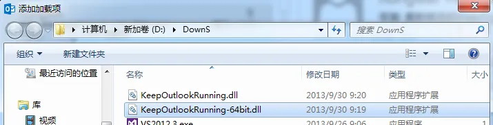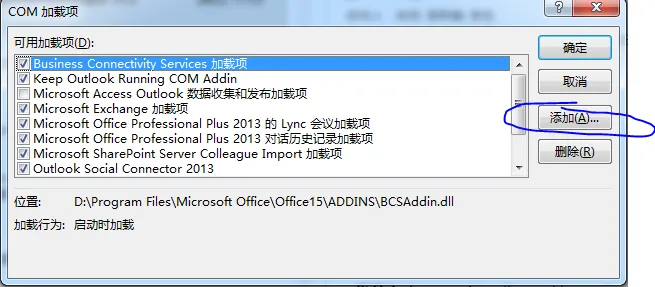 由于我的已经加载过了就已经有keep outlook Runing Com addin这一项了