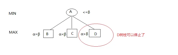 作为MAX节点,假定它的MIN节点有N个,那么当它的第一个MIN节点的评估值为α时,则对于其它节点,如果有高于α的节点,就取那最高的节点值作为MAX节点的值;否则,该点的评估值为α。