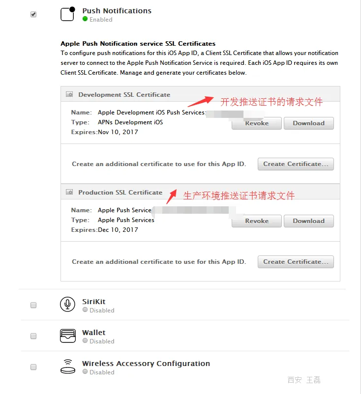点击Identifiers => App IDs 右上角点击添加按钮,沟中推送选项,点击上传开发、生成证书的请求文件,如图: