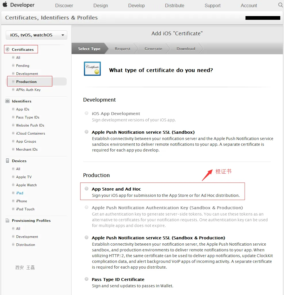 点击Certificates => Production 右上角点击添加按钮,右边主内容选择Production => App Store and Ad Hoc,我们把这个证书姑且称为“根证书”,如图: