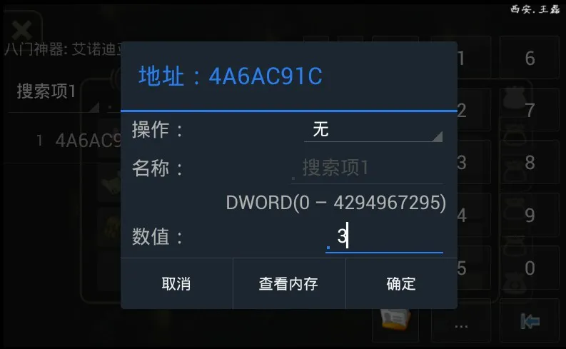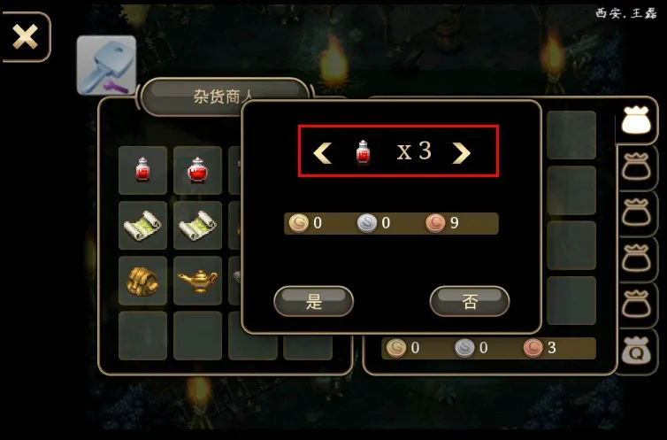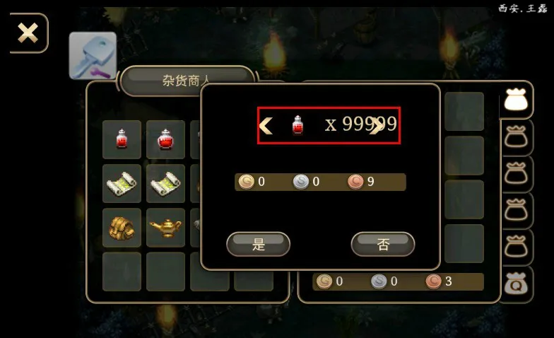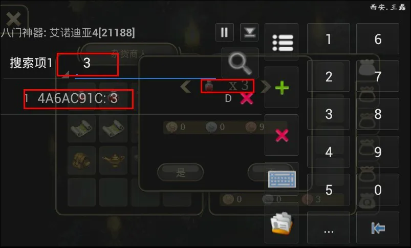 步骤2:初级游戏金钱会自动5瓶药水,找到出生地杂货店老板,选择要卖出3瓶,不要点击确定按钮,打开八门神器,搜索3会出现一个结果,点击进去,修改为99999瓶,然后单击确定,便可得到99999瓶的钱,参考下图。