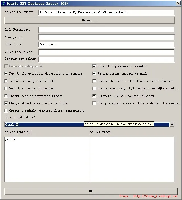 把所有不用的东西都删掉 => 设置属性“Base class”继承类设置为“Persistent” => 设置属性“Select a database:”选择你要链接的数据库 => 在下方“Select table(s)”选择你要生成的表 => 点击“OK”按钮 => Output模块就显示生成的实体类的模板代码,在web项目中添加实体类People.cs复制引用: