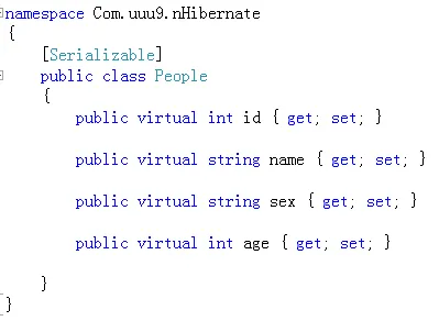 给类库起名,本测试程序名称为:Com.uuu9.nHibernate,然后把自带的Class1.cs改名为创建映射表的名称(映射实体类的名称),本示例为People.cs,其中实体类的代码为表属性的set与get,如图: