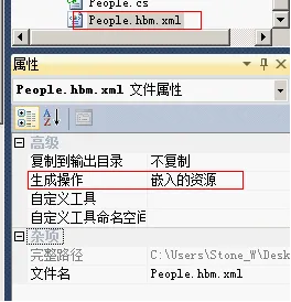 实体类的属性配置,其中“Com.uuu9.nHibernate”为上述所建类库(生成程序集的名称)的名称。注意:每个实体类对应的映射文件“实体类.hbm.xml”,都要右键设置生成类型属性为:嵌入的资源。如图: