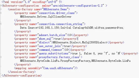 注意:“<mapping assembly="Com.uuu9.nHibernate"/>”为实体类生成程序集的名称,一直要写正确,一定要有。