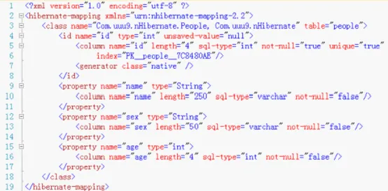 然后比较重要的一个步骤就是配置此实体类对应的映射文件,此映射xml文件名称固定为“实体类.hbm.xml”,其代码如图: