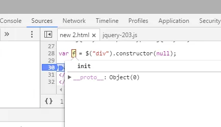 <!-- jQuery = function() { --> <!-- return new jQuery.fn.F(); --> <!-- }, --> <!-- jQuery.fn = jQuery.prototype = { --> <!-- constructor: jQuery, --> <!-- F: function() { --> <!-- }, --> <!-- } --> <!-- jQuery.fn.F.prototype = jQuery.fn; --> var f = $("div").constructor(null);