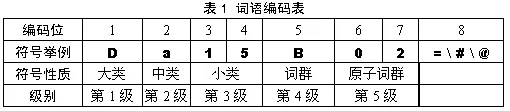表中的编码位是按照从左到右的顺序排列。第八位的标记有3种,分别是“=”、“#”、“@”, “=”代表“相等”、“同义”。末尾的“#”代表“不等”、“同类”,属于相关词语。末尾的“@”代表“自我封闭”、“独立”,它在词典中既没有同义词,也没有相关词。