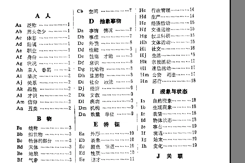 《同义词词林》是梅家驹等人于1983年编纂而成,这本词典中不仅包括了一个词语的同义词, 也包含了一定数量的同类词, 即广义的相关。《同义词词林》的编写年代久远,之后没有更新。哈工大花费了大量的人力物力完成了一部具有汉语大词表的哈工大信息检索研究室《同义词词林扩展版》,《同义词词林扩展版》收录词语近7万条。原版的《同义词词林》目录如下: