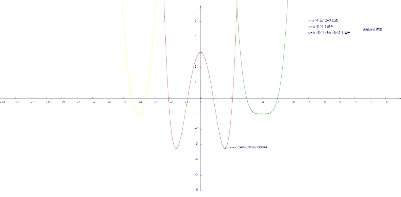 <!DOCTYPE html> <html lang="utf-8"> <meta http-equiv="Content-Type" content="text/html; charset=utf-8"/> <head> <title>绘制双二次曲线</title> </head> <body onload="draw()"> <canvas id="myCanvus" width="1300px" height="640px" style="border:1px dashed black;"> 出现文字表示你的浏览器不支持HTML5 </canvas> </body> </html> <script type="text/javascript"> <!-- function draw(){ var canvas=document.getElementById("myCanvus"); var canvasWidth=1300; var canvasHeight=640; var context=canvas.getContext("2d"); context.fillStyle = "white"; context.fillRect(0, 0, canvasWidth, canvasHeight); context.strokeStyle = "black"; context.fillStyle = "black"; // 进行坐标变换:把原点放在左下角,东方为X轴正向,北方为Y轴正向 var offsetY=320;// Y向偏移值,正值向上偏,用来画坐标轴 var offsetX=650;// X向偏移值,正值向右偏,用来画坐标轴 context.save(); context.translate(0+offsetX,canvasHeight-offsetY); drawAxisXText(context);// 文字和线分开画比较好处理 drawAxisYText(context); drawTitleText(context); context.rotate(getRad(180)); context.scale(-1,1); drawAxisX(context); drawAxisY(context); drawCurve(context); context.restore(); } function drawTitleText(ctx){ ctx.lineWidth=0.5; ctx.strokeStyle='navy'; ctx.fillStyle='navy'; var x=350; var y=-250; // 写文字 ctx.fillText("y=x^4-5x^2+3 红色",x,y); ctx.fillText("y=(x-4)^4-1 绿色",x,y+20); ctx.fillText("y=(x+4)^4+5(x+4)^2-1 黄色",x,y+40); //ctx.fillText("y=(x-7)^5 青柠色",x,y+60); //ctx.fillText("y=(x+3)^0.5 紫色",x,y+80); //ctx.fillText("y=(x+5)^0.33 栗色",x,y+100); ctx.fillText(" 绘制:逆火狂飙",x+170,y+30); } function drawCurve(ctx){ var cds=[{}]; var cds1=[{}]; var cds2=[{}]; var cds3=[{}]; var cds4=[{}]; var cds5=[{}]; var cds6=[{}]; var x,y,arr; for(x=-13;x<=13;x+=0.01){ y=Math.pow(x,4)-5*Math.pow(x,2)+3;// b<0 arr={"x":x,"y":y}; cds.push(arr); y=Math.pow(x-4,4)-1;// b=0 arr={"x":x,"y":y}; cds1.push(arr); y=Math.pow(x+4,4)+5*Math.pow(x+4,2)-1;// b>0 arr={"x":x,"y":y}; cds2.push(arr); } paintCurve(ctx,"red",cds); paintCurve(ctx,"green",cds1); paintCurve(ctx,"yellow",cds2); //paintCurve(ctx,"lime",cds3); //paintCurve(ctx,"purple",cds4); //paintCurve(ctx,"maroon",cds5); //paintCurve(ctx,"maroon",cds6);*/ var ymax=-1000,ymin=1000,xmax,xmin; for(var i=0; i<cds.length; i++){ // 求y最大值 if(cds[i].x>0 && cds[i].y>ymax){ ymax=cds[i].y; xmax=cds[i].x; } // 求y最小值 if(cds[i].x>=0 && cds[i].y<ymin){ ymin=cds[i].y; xmin=cds[i].x; } } console.log("ymin="+ymin+" xmin="+xmin+" ymax="+ymax+" ymin="+ymin+" xmax="+xmax); var SU=50;// Scale Unit // 极大值 ctx.beginPath(); ctx.moveTo(xmax*SU,ymax*SU-5); ctx.lineTo(xmax*SU,ymax*SU+5); ctx.save(); ctx.scale(1,-1); ctx.fillText("ymax="+cutShort(ymax.toString(),8),xmax*SU,-ymax*SU); ctx.restore(); ctx.stroke(); ctx.closePath(); // 极小值 ctx.beginPath(); ctx.moveTo(xmin*SU,ymin*SU-5); ctx.lineTo(xmin*SU,ymin*SU+5); ctx.save(); ctx.scale(1,-1); ctx.fillText("ymin="+ymin,xmin*SU,-ymin*SU); ctx.restore(); ctx.stroke(); ctx.closePath(); } function paintCurve(ctx,color,cds){ var SU=50;// Scale Unit ctx.strokeStyle = color; ctx.beginPath(); for(var i=0; i<cds.length; i++){ ctx.lineTo(cds[i].x*SU,cds[i].y*SU);// 注意y轴比例 } ctx.stroke(); ctx.closePath(); } function drawAxisX(ctx){ ctx.save(); ctx.lineWidth=0.5; ctx.strokeStyle='navy'; ctx.fillStyle='navy'; var start=-650; var end=650; // 画轴 ctx.beginPath(); ctx.moveTo(start, 0); ctx.lineTo(end, 0); ctx.stroke(); ctx.closePath(); // 画箭头 ctx.beginPath(); ctx.moveTo(end-Math.cos(getRad(15))*10, Math.sin(getRad(15))*10); ctx.lineTo(end, 0); ctx.lineTo(end-Math.cos(getRad(15))*10, -Math.sin(getRad(15))*10); ctx.stroke(); ctx.closePath(); // 画刻度 var x,y; y=5; for(x=start;x<end;x+=50){ ctx.beginPath(); ctx.moveTo(x, 0); ctx.lineTo(x, y); ctx.stroke(); ctx.closePath(); } ctx.restore(); } function drawAxisXText(ctx){ ctx.lineWidth=0.5; ctx.strokeStyle='navy'; ctx.fillStyle='navy'; var start=-650; var end=650; // 写文字 var x,y=5; for(x=start;x<end;x+=50){ ctx.fillText(x/50,x,y+10); } } function drawAxisY(ctx){ ctx.save(); ctx.lineWidth=0.5; ctx.strokeStyle='navy'; ctx.fillStyle='navy'; var start=-300; var end=300; // 画轴 ctx.beginPath(); ctx.moveTo(0, start); ctx.lineTo(0, end); ctx.stroke(); ctx.closePath(); // 画箭头 ctx.beginPath(); ctx.moveTo(Math.sin(getRad(15))*10, end-Math.cos(getRad(15))*10); ctx.lineTo(0, end); ctx.lineTo(-Math.sin(getRad(15))*10, end-Math.cos(getRad(15))*10); ctx.stroke(); ctx.closePath(); // 画刻度 var x,y; x=5; for(y=start;y<end;y+=50){// 注意y轴比例 ctx.beginPath(); ctx.moveTo(x, y); ctx.lineTo(0, y); ctx.stroke(); ctx.closePath(); } } function drawAxisYText(ctx){ ctx.lineWidth=0.5; ctx.strokeStyle='navy'; ctx.fillStyle='navy'; var start=-250; var end=350; // 写文字 var x=-19,y=5; for(y=start;y<end;y+=50){ if(y!=0){ ctx.fillText(-y/50,x,y);// 注意y轴比例 } } } function getRad(degree){ return degree/180*Math.PI; } function cutShort(str,length){ if(str.length>length){ str=str.substr(0,length)+"..."; } return str; } //--> </script>
