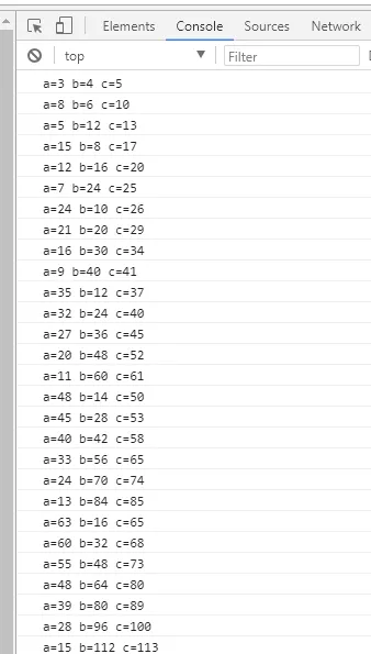 // 输出勾股数 var m,n for(m=2;m<10;m++){ // m的上限可以放大 for(n=1;n<m;n++){ var a=m*m-n*n; var b=2*m*n; var c=m*m+n*n; console.log("a="+a+" b="+b+" c="+c); } }