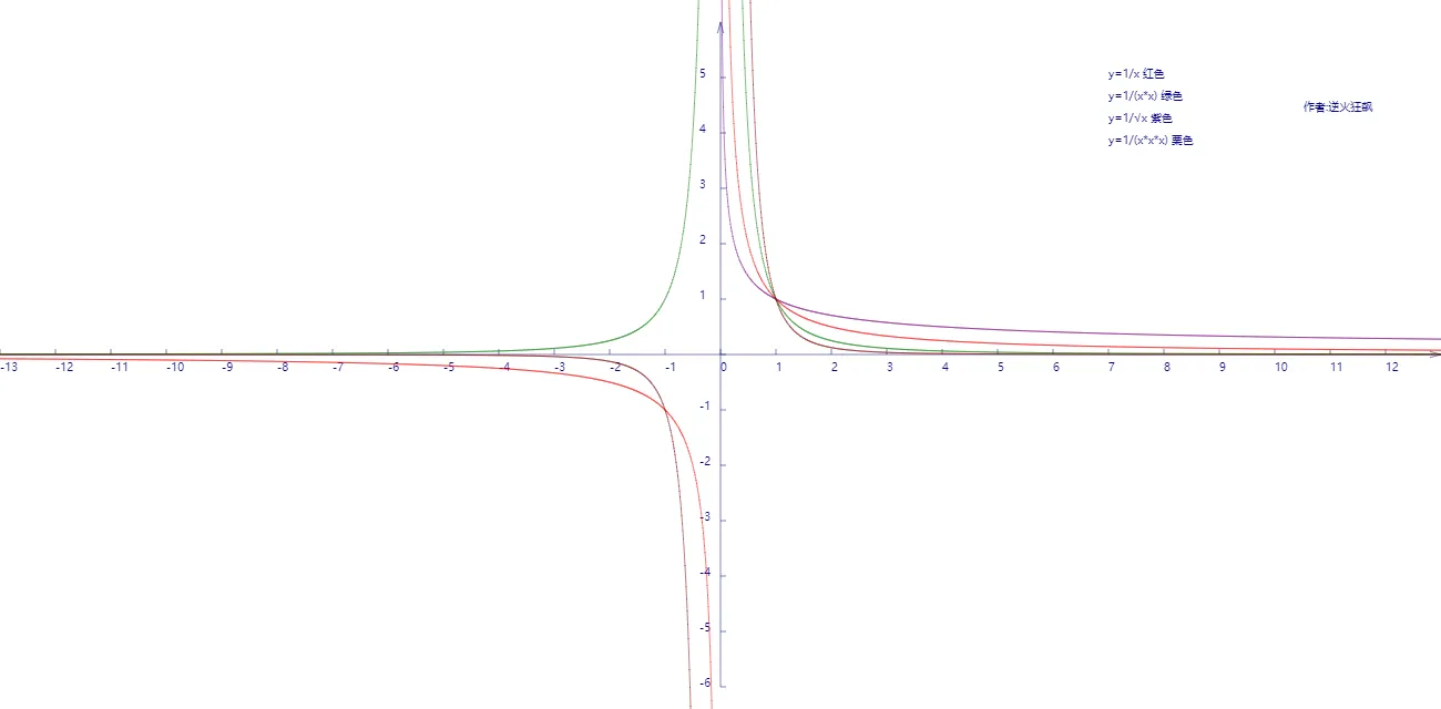 点评:下图展示了各种双曲类曲线,形状类似,因为无论x的幂级数是多少,都可以把它设为一个新变量,这样又变成了标准双曲线的形式,比如说y=1/(x2),设x2为w,函数又变成y=1/w。这类曲线像是被支点(1,1)顶住的钢丝,两端在不断逼近坐标轴,x的幂级数大的逼近x轴更快,相对逼近y轴就慢些;相反x的幂级数小的逼近x轴慢,相对逼近y轴就快些。
