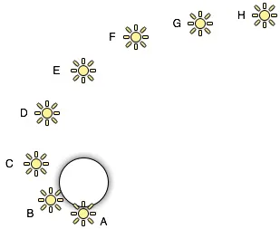 例如,如果有一个物体受到若干光源的影响(下图中的圆圈,受到光源A到H的影响)