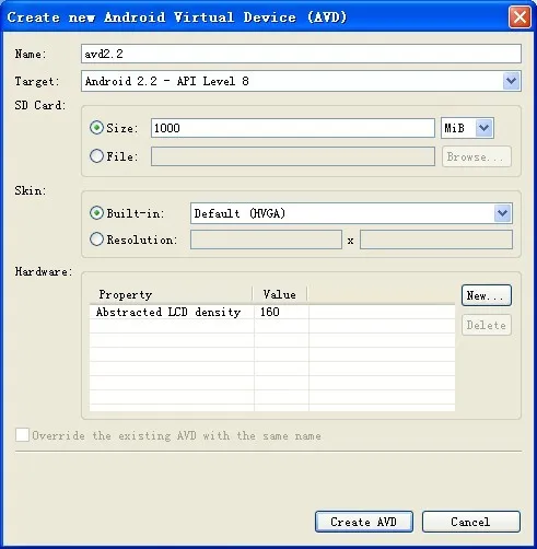 选择Virtual Device->New 创建AVD 如图: