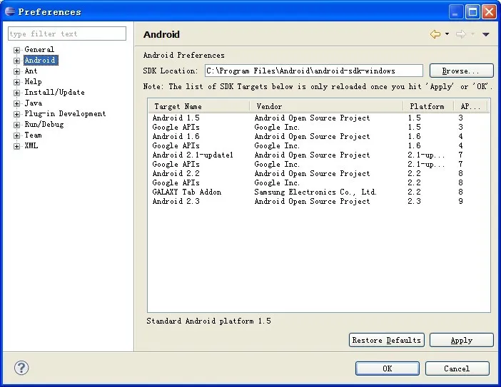 安装成功后可以点击菜单栏的window->perferences 可以看到Android,表示刚才安装成功