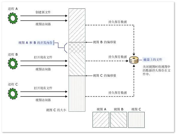 3)如果文件大于应用程序用于内存映射的逻辑内存空间(在 32 位计算机上为2GB),则还需要使用多个视图。