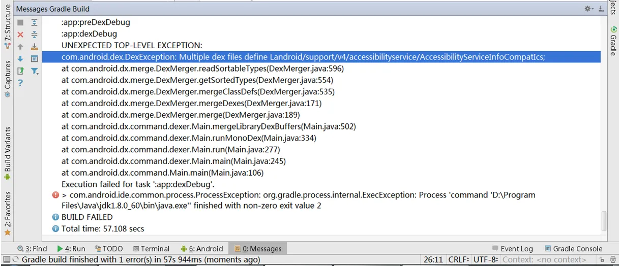Error:Execution failed for task ':app:dexDebug'. > com.android.ide.common.process.ProcessException: org.gradle.process.internal.ExecException: Process 'command 'D:\Program Files\Java\jdk1.8.0_60\bin\java.exe'' finished with non-zero exit value 2