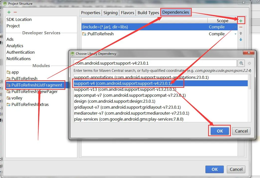 dependencies { compile fileTree(include: ['*.jar'], dir: 'libs') compile project(':PullToRefresh') compile 'com.android.support:support-v4:23.0.1' }